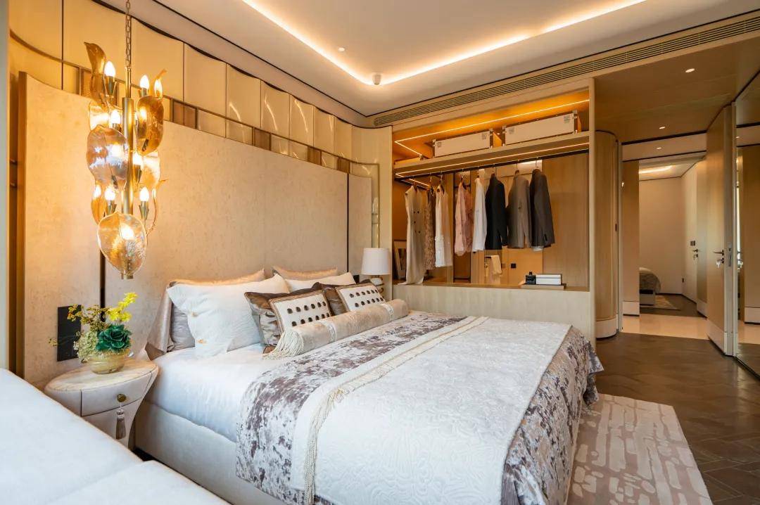 最多的样板间,吊顶、客厅墙面及卧室背景墙均采用大量曲面处理,涵盖木饰面与奢石等多种材质弧形工艺,即便工序复杂且成本高昂,但绿城仍坚持落实,只为业主更高级的使用体验