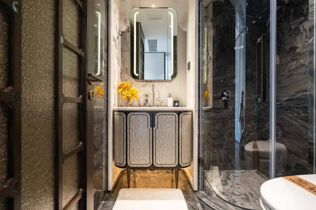 ;来自巴西进口的静雅棕石材在有些顶豪中仅用于卫生间点缀,而在绿城黄浦ONE,则将其大量运用于地面铺装建面约193m²户型样板间实拍